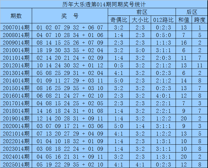 袁军师体彩大乐透第2026014期历史同期奖号分析: