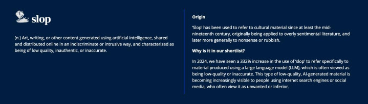 在无人注意的角落,牛津去年的年度词汇候选列表里,还有另一个与 AI 直接相关的词,「slop」,意指「由人工智能生成的劣质网络内容」。虽然最后未当选,但它出现在提名中本身就说明,AI 生成的内容,数量已经到了惹人反感的地步。
