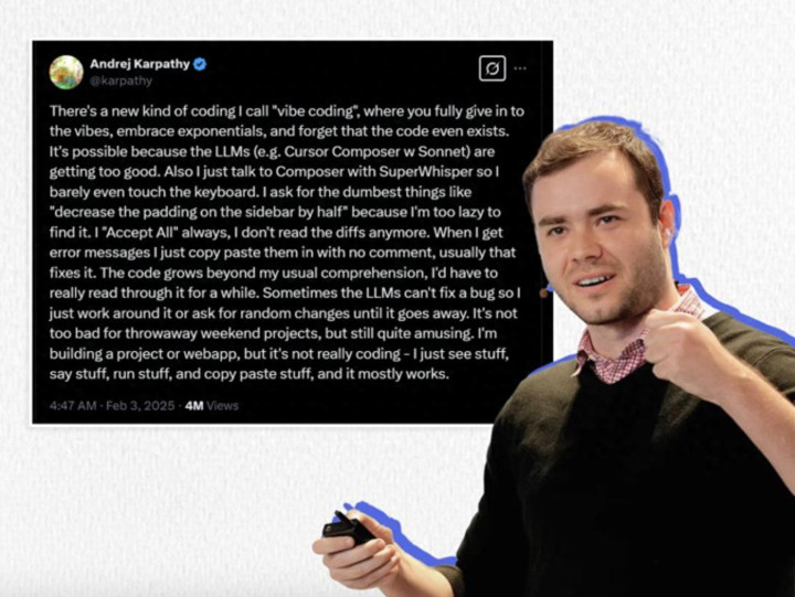「Vibe coding」在中文里并没有一个完美的翻译,比较流行的译法是「氛围编程」。这个词最早由特斯拉前 AI 总监、OpenAI 创始工程师 Andrej Karpathy 提出,形象地描述了 AI 能让人们「几乎忘记代码本身存在」也可以开发应用的情景。