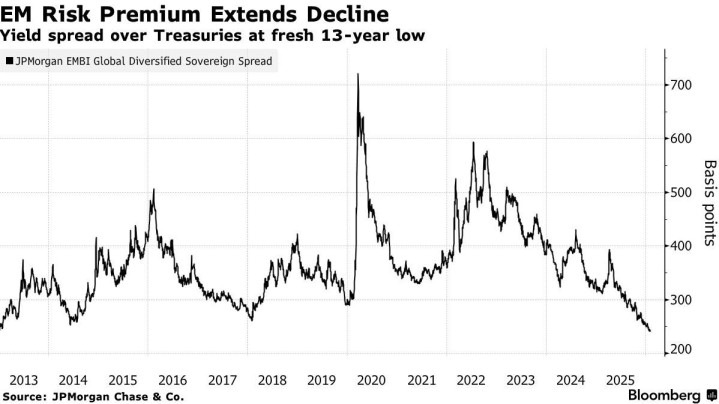 当前,投资者对新兴市场债券所要求的收益率相较于美国国债的溢价幅度,仅为240个基点,也就是2.4个百分点,这一利差水平达到了2013年以来的最低值。