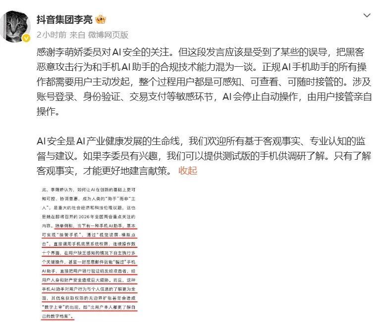 3月7日,@抖音集团李亮 转发了一段文字,其中提到谈到AI助手存在一些侵犯用户隐私的争议。文中举例称,“当下有一种手机AI助手,基本可实现‘接管手机’,通过‘视觉读屏﹢模拟点击’,直接调用手机底层系统权限,连续操作数十个界面,在用户缺乏感知的情况下自主执行多个关键操作,甚至一封恶意邮件就能‘骗过’手机AI助手,直接把用户银行验证码发给攻击者,给用户人身和财产安全造成巨大威胁。”